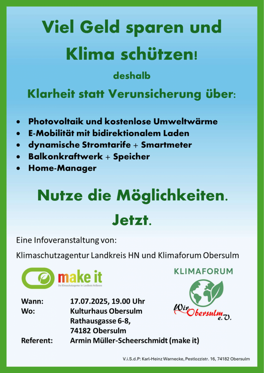 Das Klimaforum Obersulm lädt alle Interessierten Bürgerinnen und Bürger herzlich zur Informationsveranstaltung "Energiewende Vor Ort" ein.